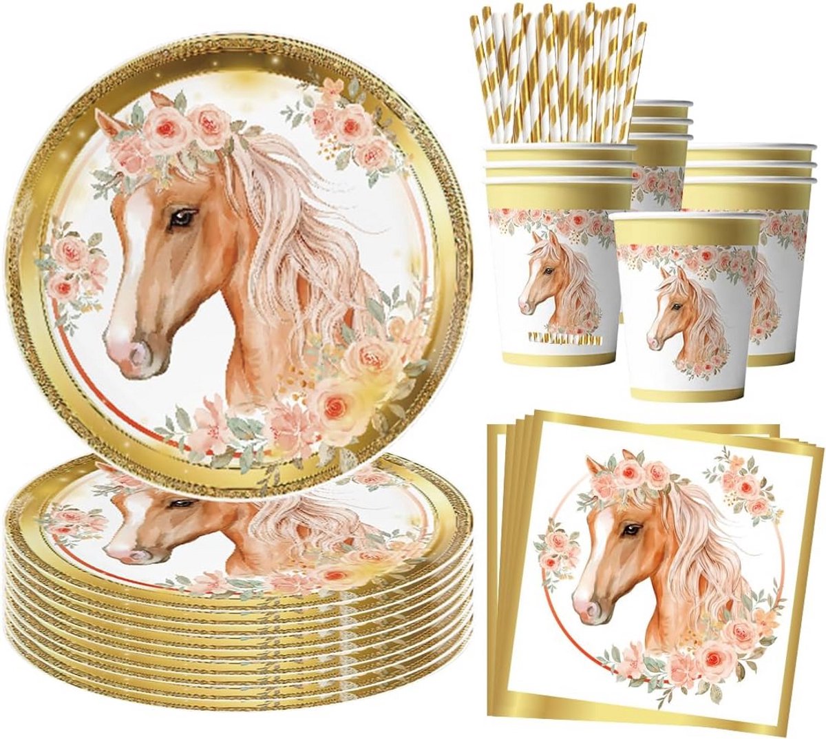 Deze 68-delige feest tafelset met een prachtig paarden thema is perfect voor verjaardagsfeesten van zowel jongens als meisjes. Met papieren bordjes, bekers en servetten, is deze set geschikt voor 16 gasten. Creëer een feestelijke sfeer en maak de verjaardag van uw kind onvergetelijk met deze vrolijke en kleurrijke decoraties.