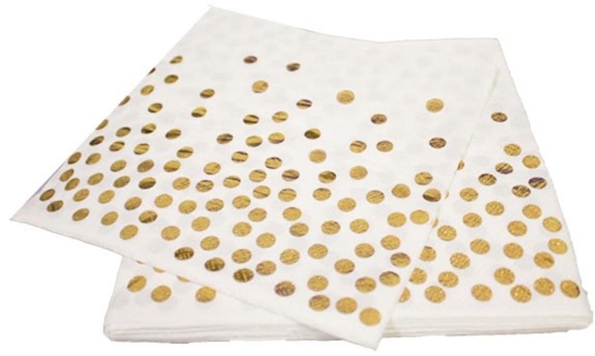 Vier je verjaardag met deze leuke 2-laagse servetten. De servetten hebben een witte achtergrond en zijn bedrukt met de polka stippen in goudfolie. In een verpakking zitten 20 servetten. De folieprint zit alleen aan de voorzijde van de servet. SPECIFICATIES Inhoud: 20 servetten Afmeting: 33 x 33 cm (uitgevouwen) Materiaal: papier