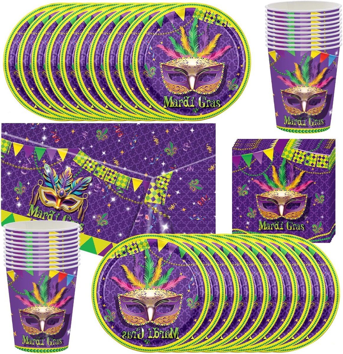 Unieke en opvallende ontwerpen: De set is ontworpen in de klassieke kleuren paars, geel, rood en groen, versierd met verschillende Mardi Gras patronen. De opdruk van “Mardi Gras” zorgt voor een unieke uitstraling die jouw gasten zeker zal imponeren.