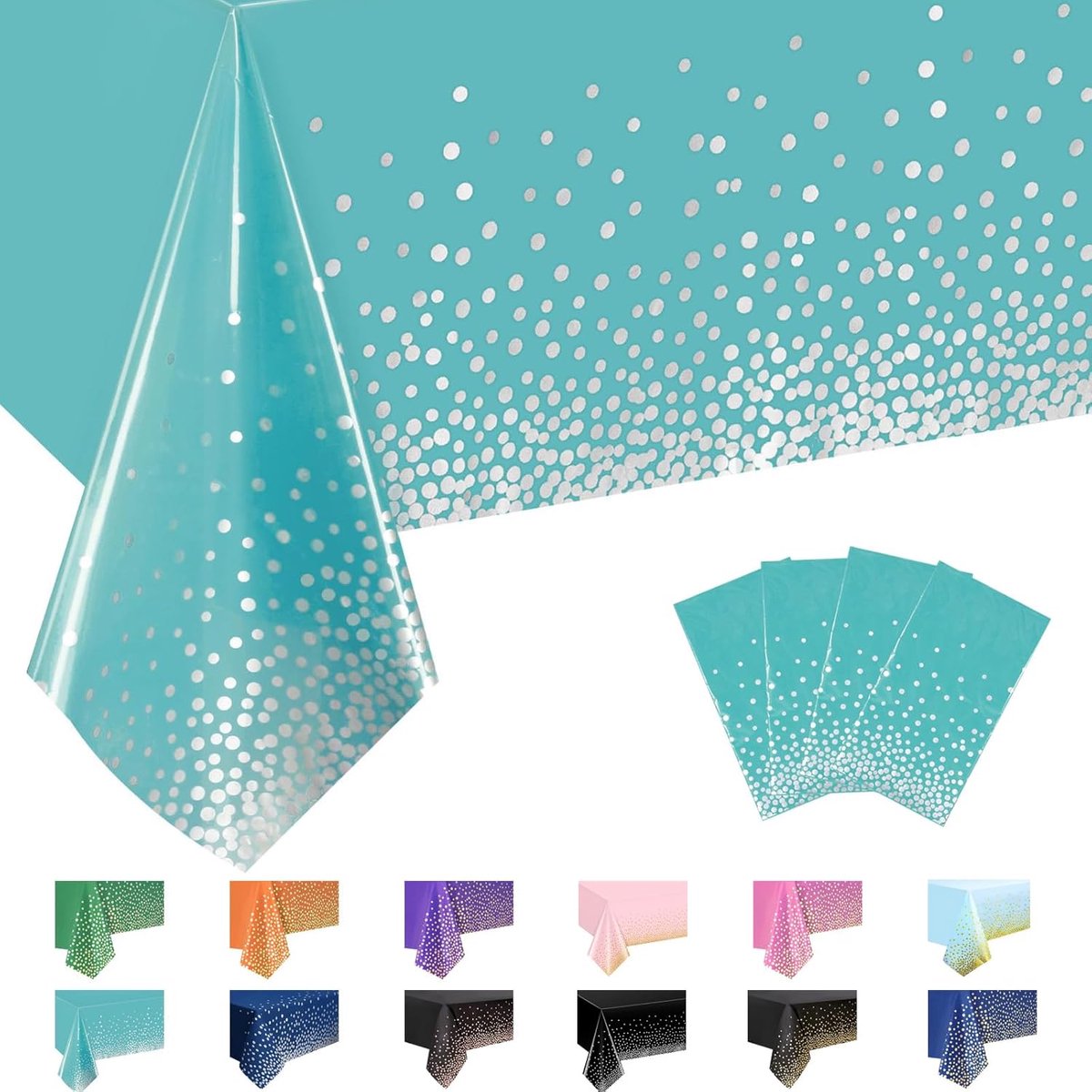 Rechthoekig tafelkleed, zeeblauw en zilverpoeder, 4 stuks, 137 x 274 cm, stippen, confetti, waterdicht, vlekbescherming, tafeldekking voor feesten
