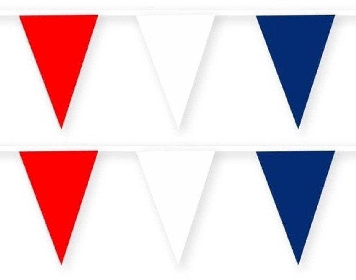 2x Amerika/USA stoffen vlaggenlijnen/slingers 10 meter van katoen. Stevige vlaggenlijn van katoenen stof, met daaraan 24 puntvlaggetjes in de kleuren van de Amerikaanse vlag: rood, wit en blauw. De vlaggetjes zijn aan beide zijden gekleurd. Landen thema Amerika/USA/VS vlaggenlijn voor tijdens Memorial Day, The 4th of July/Independence Day, Labor Day, Patriot Day, Veterans Day, Thanksgiving of een WK.