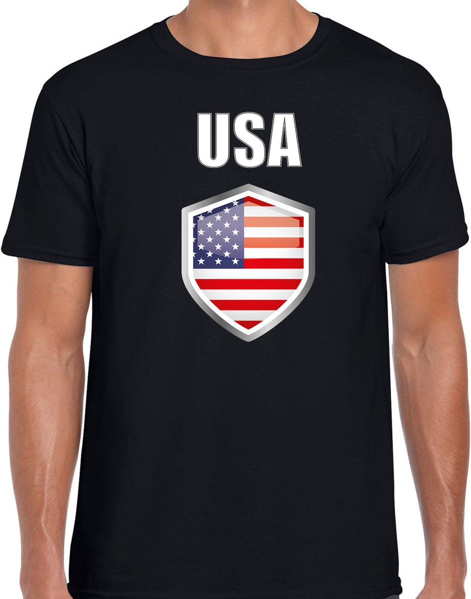 Amerika / USA landen supporters t-shirt, met vlag schild, in het zwart, voor heren. Op dit fan shirt staat een vlaggenschild met de landen vlag en de tekst: USA / America. dit t-shirt is leuk om cadeau te geven aan iemand die naar Amerika / USA gaat of fan / supporter is van Amerika / USA.