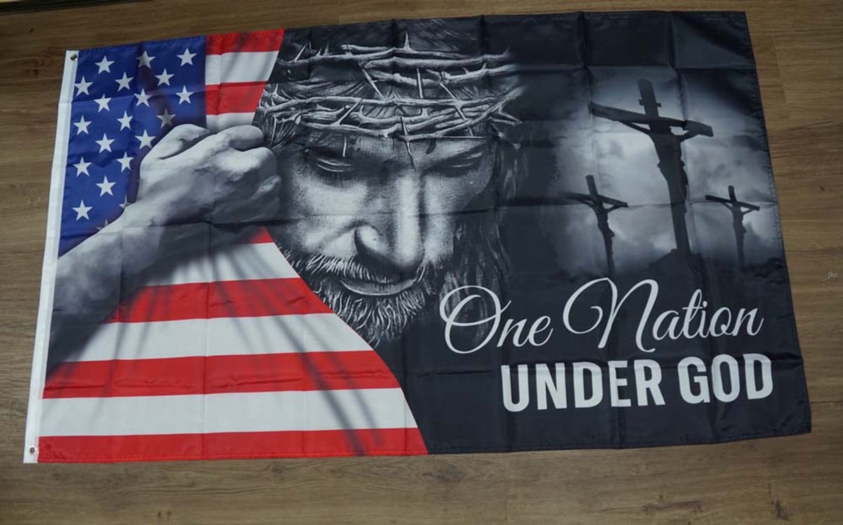 Amerikaanse vlag one nation under god Jezus – gevelvlag Jezus met Amerikaanse vlag – decoratie vlag Jezus aan kruis – Amerika vlaggen – Vlag one nation under god – deco vlag amerika – geschiedenis vlag van Amerika