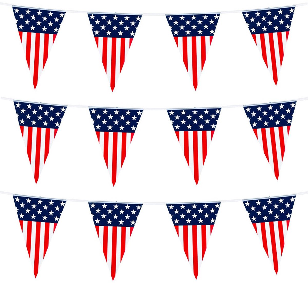 4x vlaggenlijn of vlaggetjes Amerika/USA van 6 meter. Vlaggenlijn met Amerikaanse vlag print. De vlaggenlijn is gemaakt van plastic. De vlaggenlijn is 6 meter lang en heeft ca 2 meter ophanglijn. De vlaggetjes zijn ca 30 x 20 cm groot. Deze vlaggenlijn is geschikt voor binnen en buiten gebruik, echter is deze niet UV-bestendig. Landen versieringen.