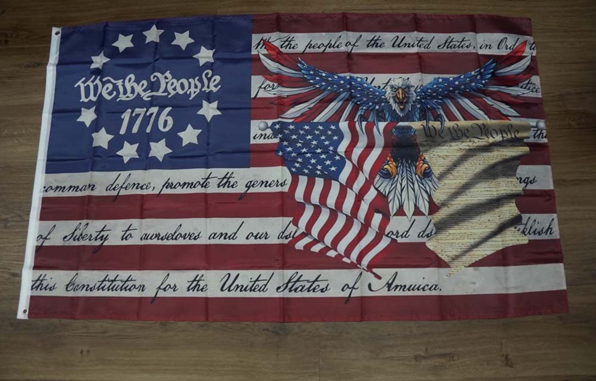Vlag Amerika ” We are the people ” – Vlag adelaar met vleugels gespreid – Amerikaanse gevelvlag – decoratieve vlag WE ARE THE PEOPLE 1776 – vlaggen geschiedenis Amerika – Stars and Stripes vlaggen – geschiedenis vlaggen – vlaggen decoratief adelaar