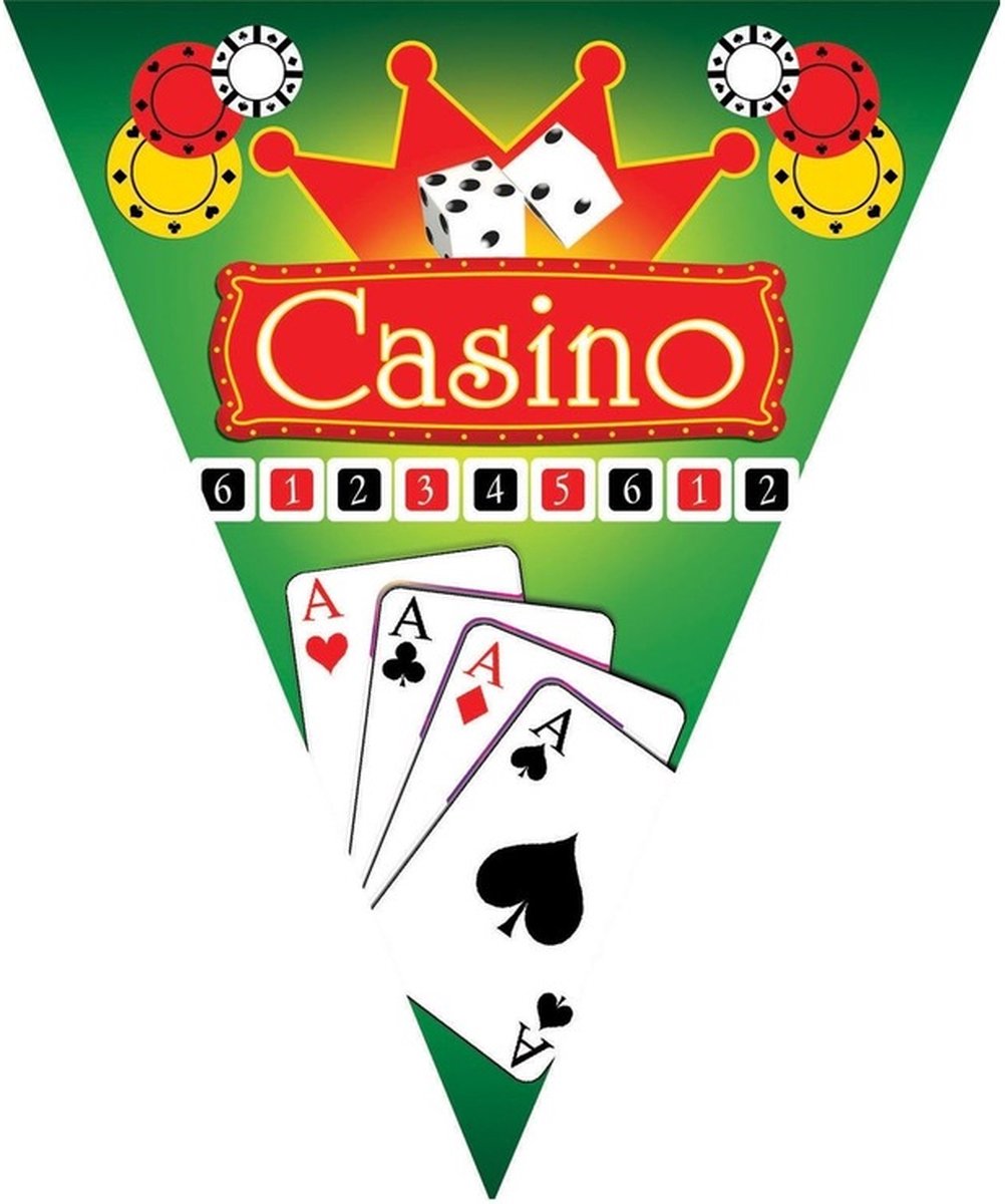 Casino vlaggenlijn. Breng de sfeer van Las Vegas naar je feestje met deze vrolijke vlaggenlijn in casinostijl! De lijn is 5 meter lang, gemaakt van stevig kunststof en bedrukt met klassieke casinobeelden zoals kaarten, fiches en dobbelstenen. Ideaal voor een casino-, Hollywood- of glamourthemafeest.