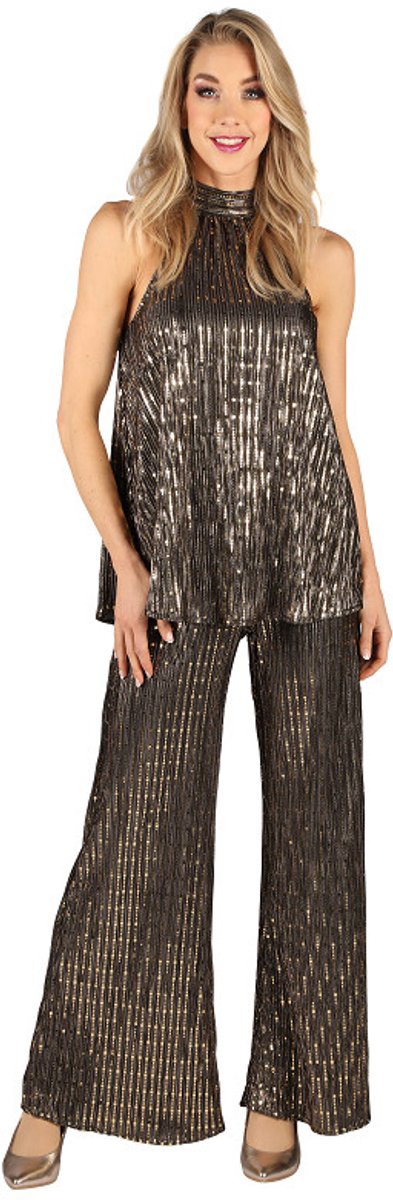 Disco kostuum bestaande uit top en broek in de kleur goud.