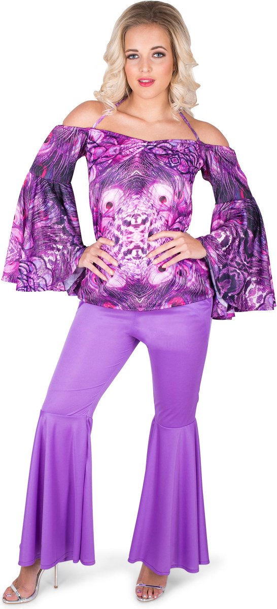 Dit disco kostuum voor dames bevat een top en een broek. (Schoenen niet inbegrepen). Het bovenstuk is paars met hippie motieven. De lange mouwen zorgen voor een echte disco look. De broek is paars met wijd uitlopende pijpen. Dit disco kostuum voor vrouwen is perfect voor een jaren 70 feest.