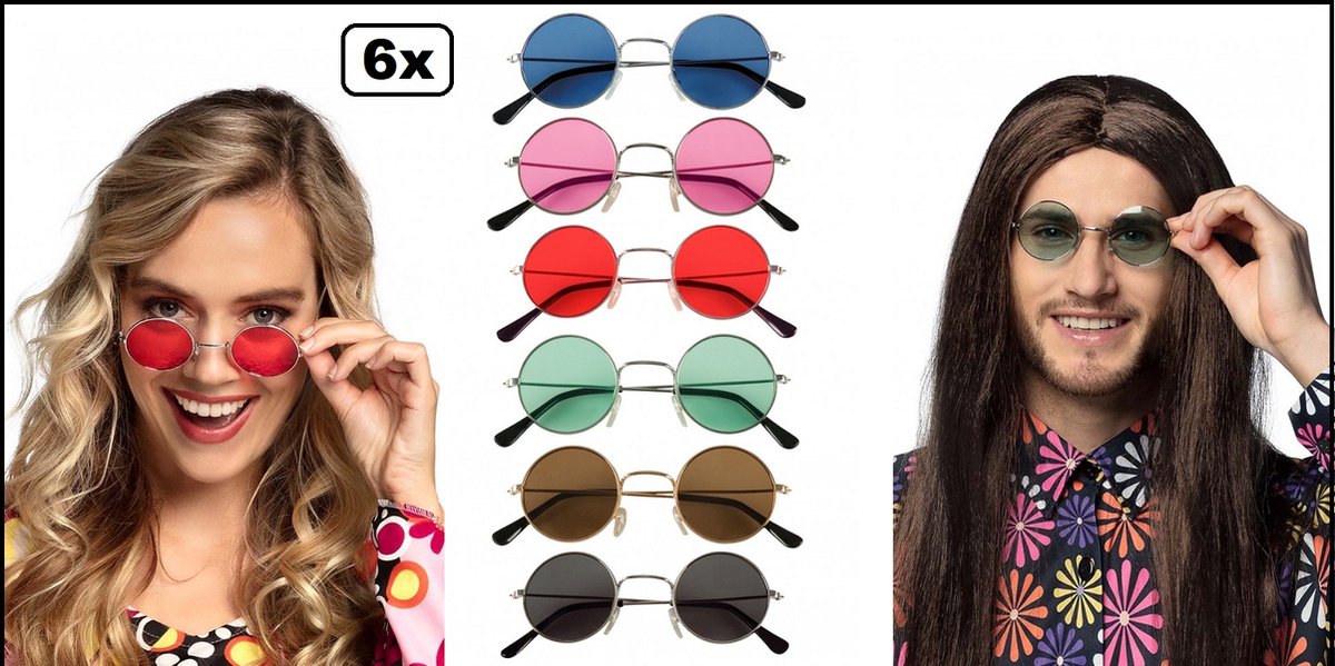 6x Bril flower power 70s/80s assortie – John lennon bril beatles rond 70s and 80s disco peace flower power happy together toppers