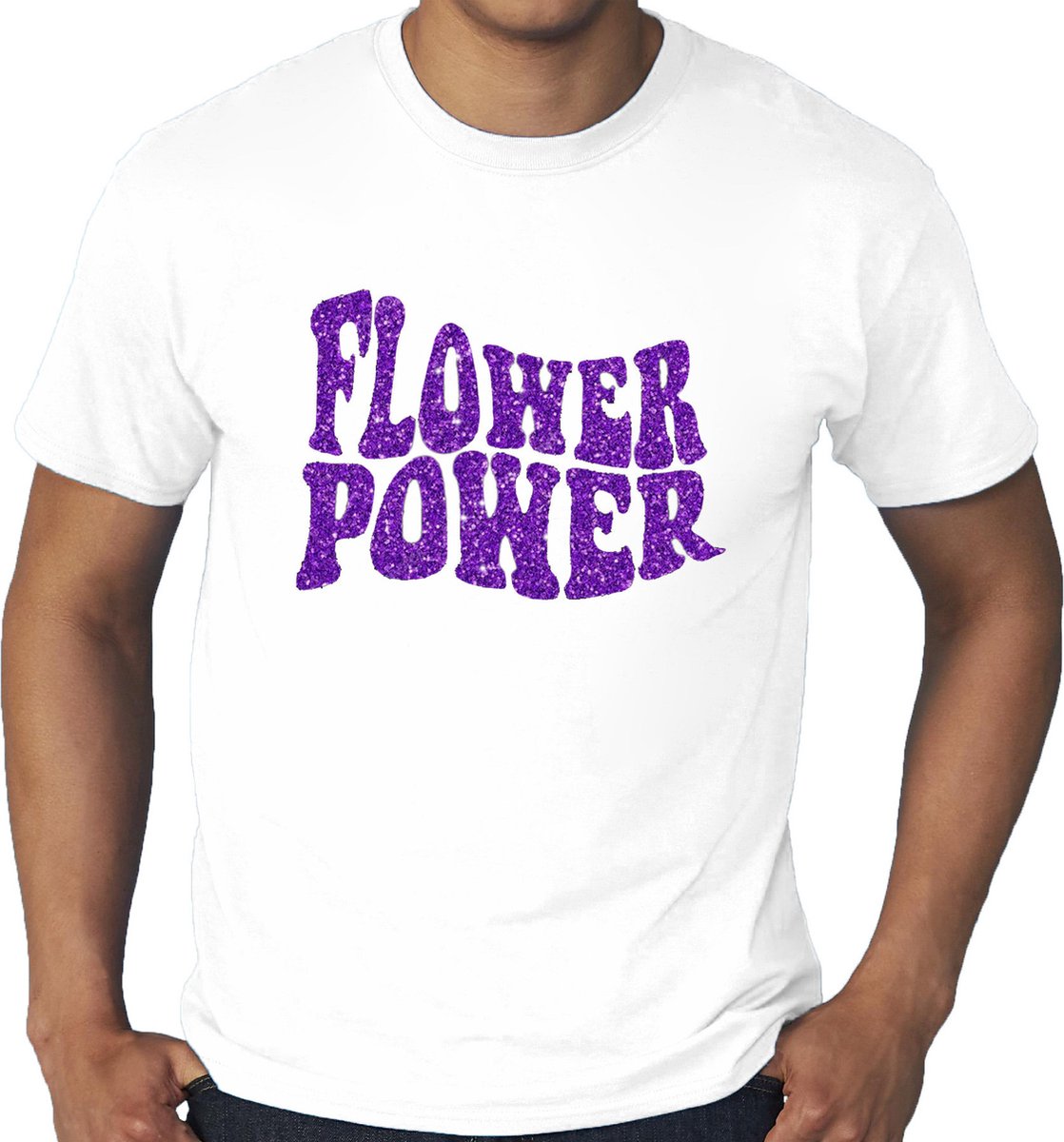 Grote Maten Flower Power t-shirt wit met paarse letters heren. Op dit shirt staat groot de tekst: Flower power in golvende paarse glitter letters. Leuk om bijvoorbeeld te dragen naar een feest met een sixties/60s/Flower Power/hippie thema of gewoon zomaar. Materiaal: 150 grams, 100% katoen.