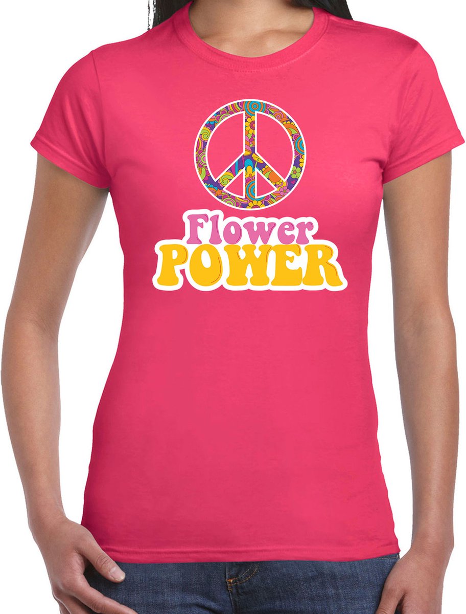 Jaren 60 Flower Power verkleed shirt roze dames. Op dit roze sixties shirt staat een groot peace teken en de tekst Flower Power in roze en geel gekleurde letters. Leuk om bijvoorbeeld te dragen naar een feest met een sixties/60s/Flower Power/hippie thema of gewoon zomaar.Materiaal: 150 grams, 100% katoen.