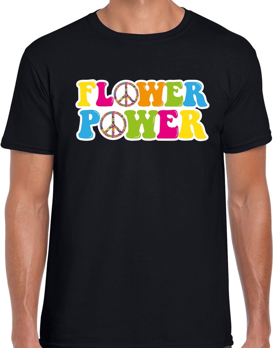 Jaren 60 Flower Power verkleed shirt zwart heren. Op dit zwarte sixties shirt staan peace tekens en de tekst Flower Power in gekleurde letters. Leuk om bijvoorbeeld te dragen naar een feest met een sixties/60s/Flower Power/hippie thema of gewoon zomaar.Materiaal: 150 grams, 100% katoen.