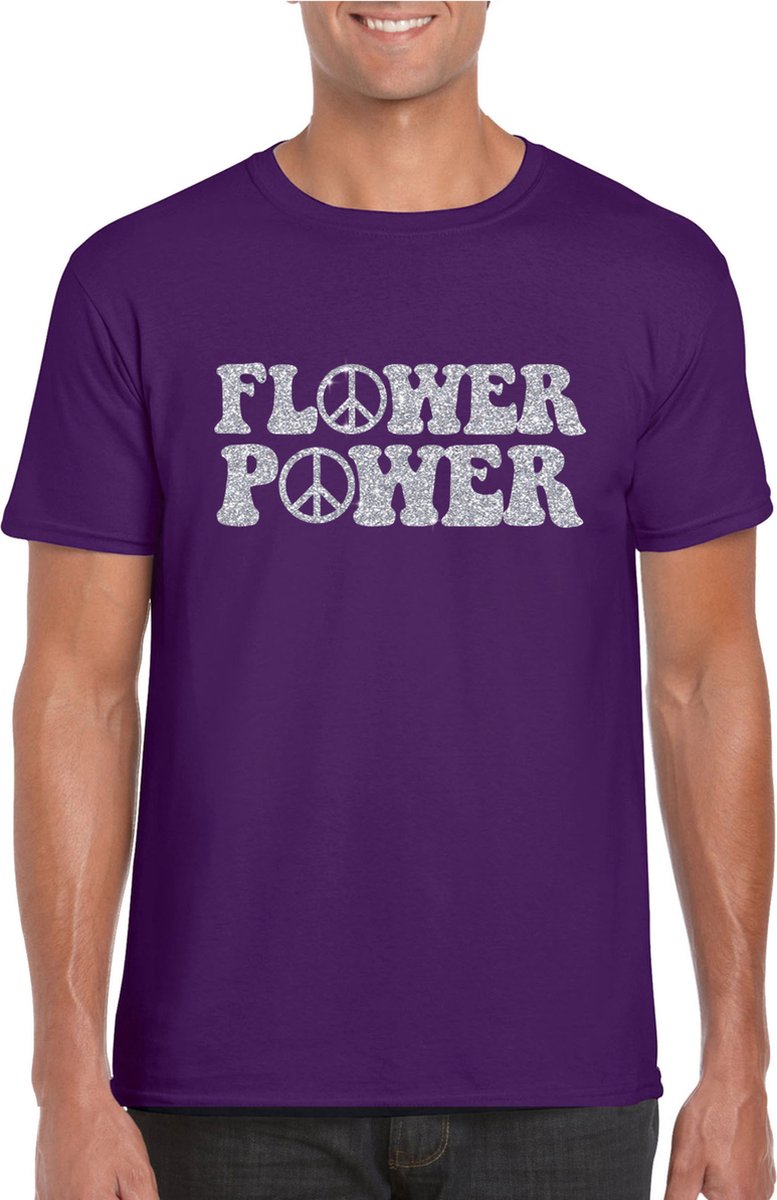 Paars Flower Power t-shirt met zilveren letters heren. Op dit shirt staat groot de tekst: Flower power met peace tekens in zilveren glitter letters. Leuk om bijvoorbeeld te dragen naar een feest met een sixties/60s/Flower Power/hippie thema of gewoon zomaar. Materiaal: 150 grams, 100% katoen.