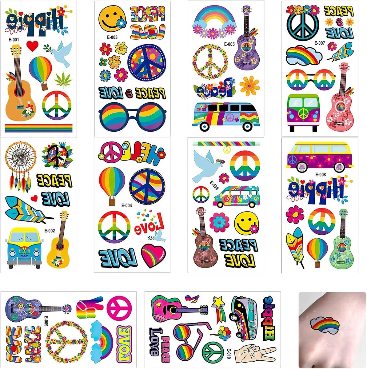 Tijdelijke Hippie Tattoos – 10 Bladen – Kleurrijke Flower Power Stickers – Liefde en Vrede Symbolen voor Volwassenen en Kinderen – Ideaal voor Hippie Feesten, Verjaardagen en Meer