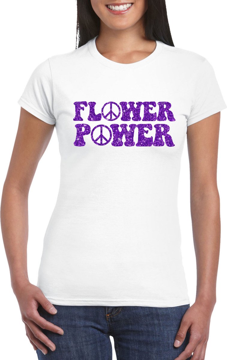 Wit Flower Power t-shirt met paarse letters dames. Op dit shirt staat groot de tekst: Flower power met peace tekens in paarse glitter letters. Leuk om bijvoorbeeld te dragen naar een feest met een sixties/60s/Flower Power/hippie thema of gewoon zomaar. Materiaal: 150 grams, 100% katoen.