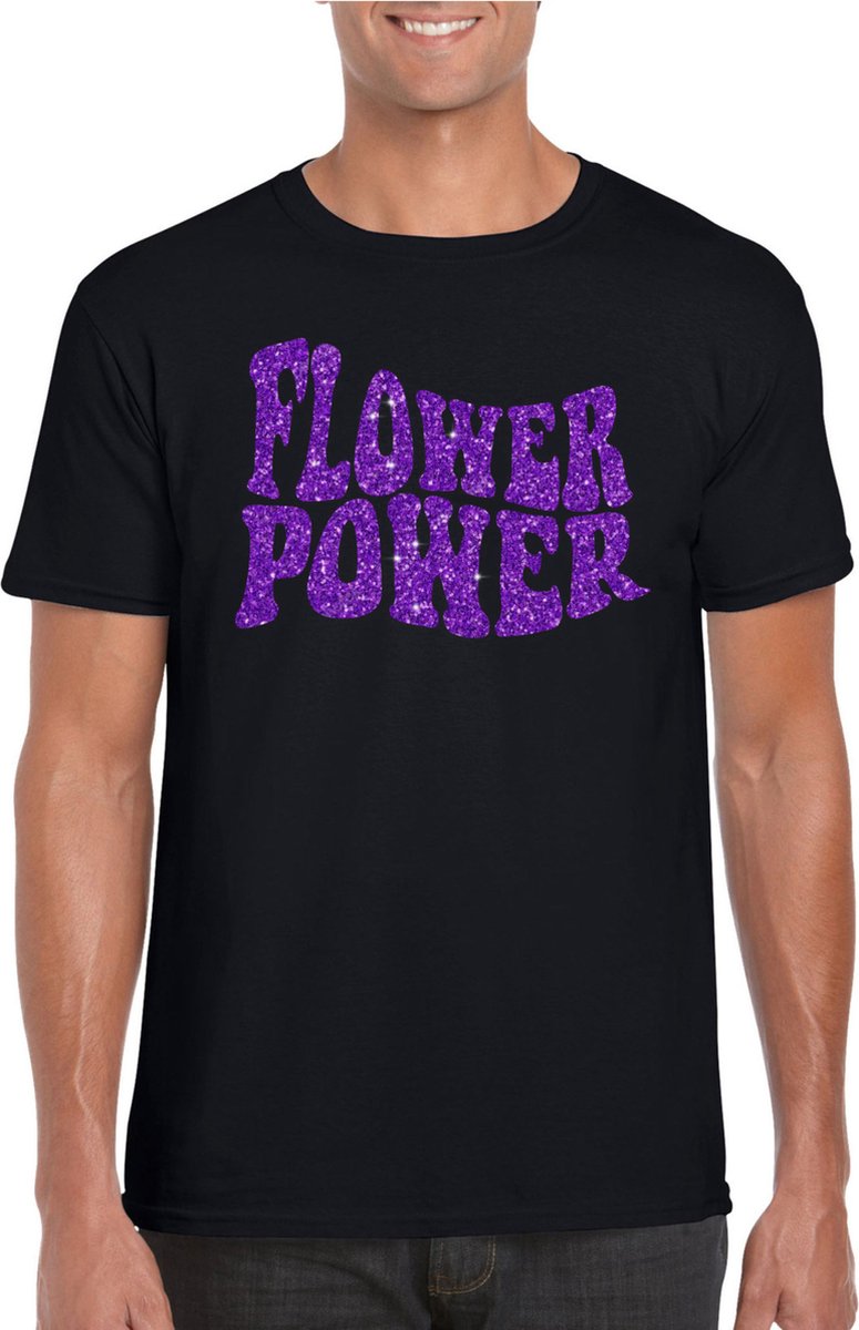 Zwart Flower Power t-shirt met paarse letters heren. Op dit shirt staat groot de tekst: Flower power in golvende paarse glitter letters. Leuk om bijvoorbeeld te dragen naar een feest met een sixties/60s/Flower Power/hippie thema of gewoon zomaar. Materiaal: 150 grams, 100% katoen.