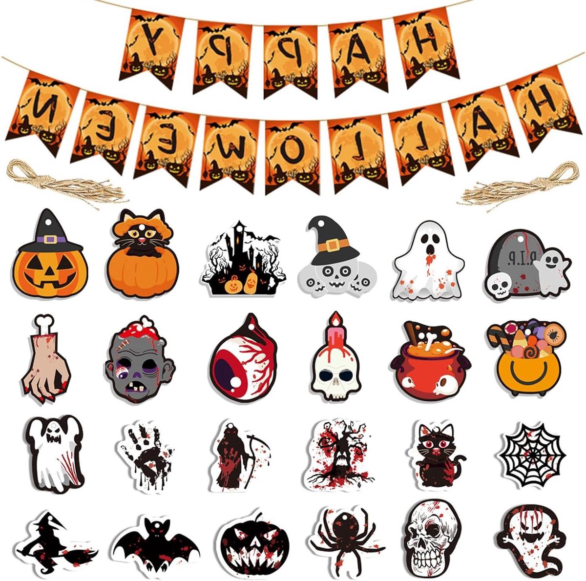 Inhoud van de verpakking: het pakket bevat 1 “Happy Halloween” banner en 24 stuks Halloween-patronen decoratie. Het patroon is speciaal ontworpen voor Halloween Party & All Hallows’ Day.