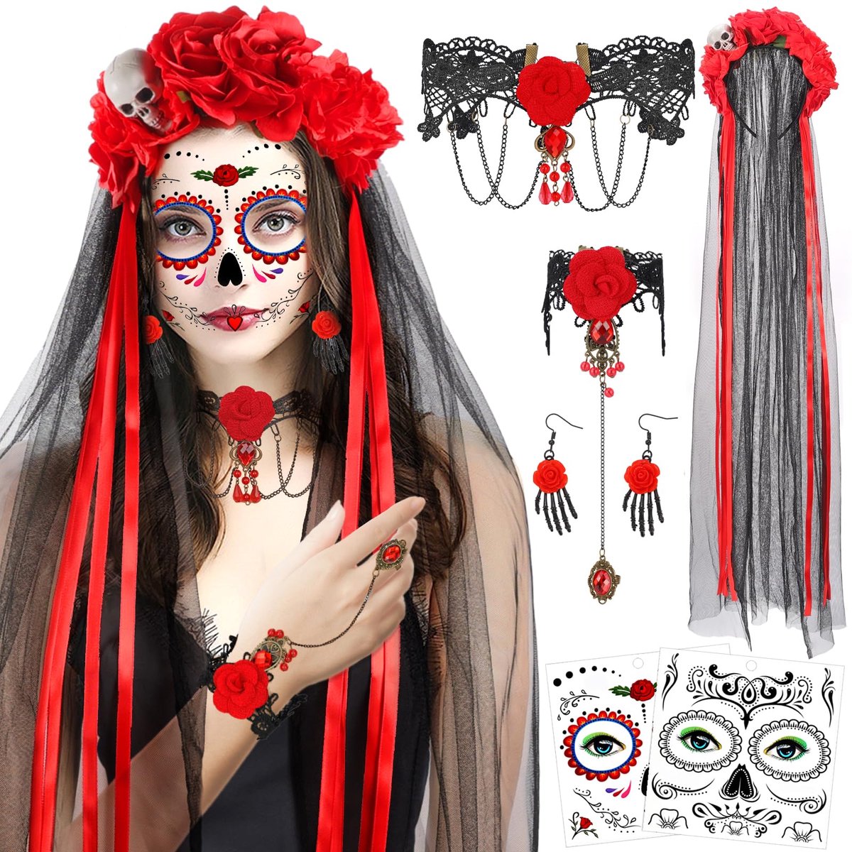 Halloween Dag van de Doden Hoofdband Sluier Rose Bloemen Kroon Halloween Gezicht Tattoos Dag van de Doden Tijdelijke Tattoo voor Halloween Fancy Dress Kostuum