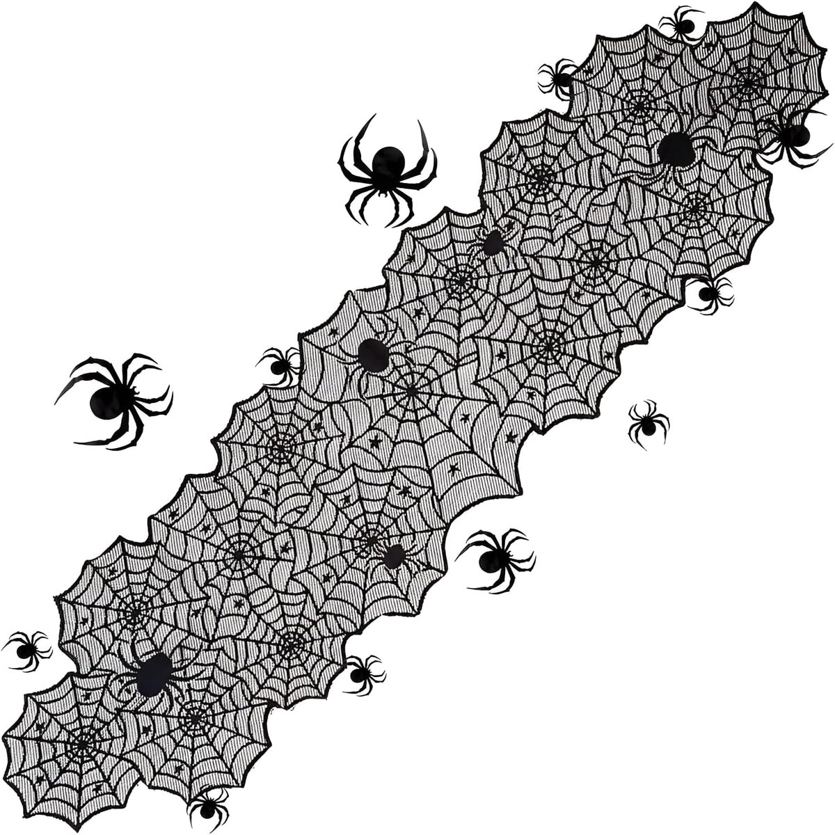 Halloween decoratieset – Halloween tafelloper spinnenweb 180 × 45 cm 1 + spinnendecoratie * 13, Halloween tafelkleed, tafelloper Halloween tafeldecoratie voor Halloween tafeldecoratie