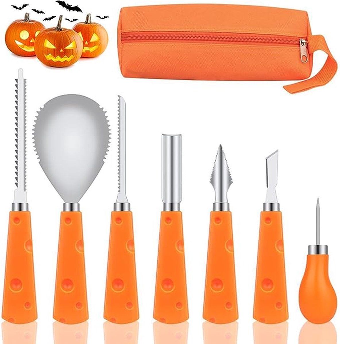 Halloween pompoensnijset, 7 stuks, roestvrij staal, pompoen, snijgereedschap met opbergtas, professionele pompoensnijgereedschap, set, snijmessen, pompoen, doe-het-zelf, voor kinderen en volwassenen