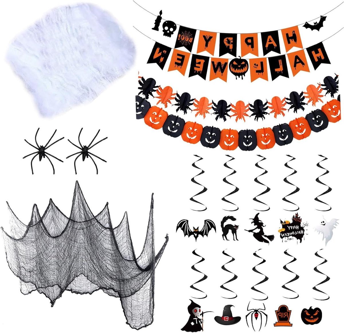 Over dit item Complete set voor Halloween-feestversiering: Deze set bevat alles wat je nodig hebt om je Halloween-feest compleet te maken. Inclusief 10 spiraalvormige hangers, een Halloween krans, 2 zwarte en gele spinnenversieringen, een zwart-geel spinnenweb, een groot Halloween decoratiedoek van 76×300 cm, en 20 gram witte kunstspinnenweb, inclusief 2 kleine plastic spinnetjes. Alles in één handige set om je ruimte in Halloween-stijl om te toveren.