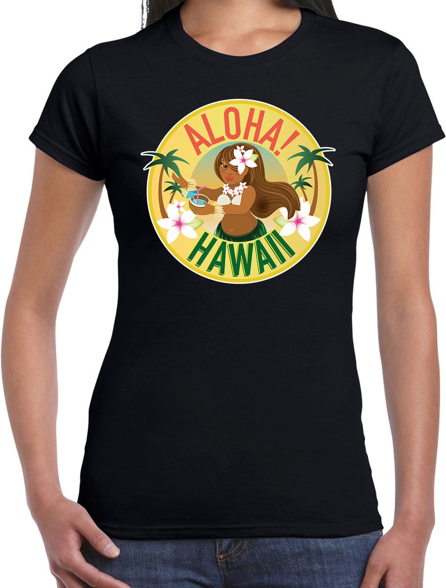 Hawaii feest t-shirt / kleding Aloha Hawaii zwart voor dames. Dit feestelijke Hawaii shirt is bedrukt met kleurrijke Hawaiiaanse bloemen, palwomen en een Hawaiiaanse vrouw en de tekst: Aloha! Hawaii.
