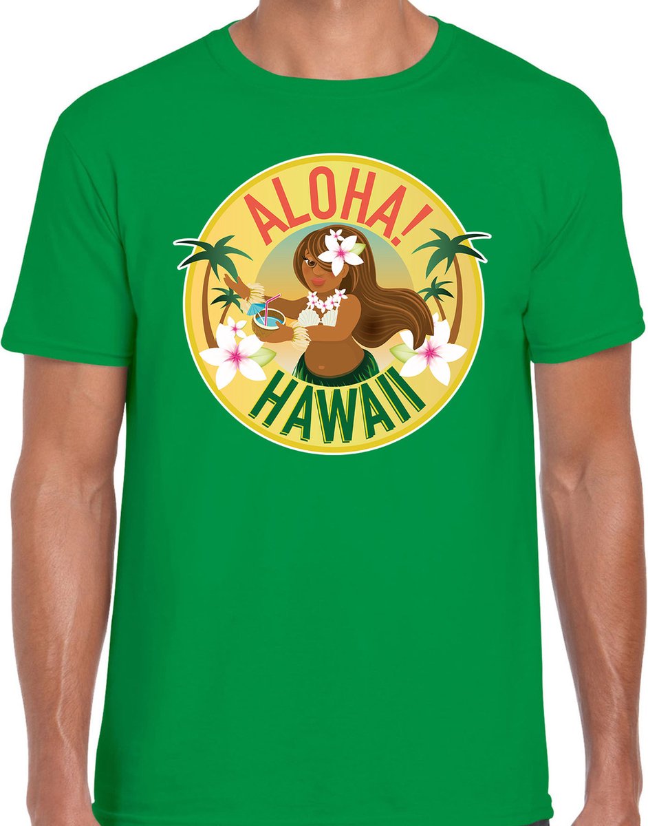 Hawaii feest t-shirt / kleding Aloha Hawaii groen voor heren. Dit feestelijke Hawaii shirt is bedrukt met kleurrijke Hawaiiaanse bloemen, palmen en een Hawaiiaanse vrouw en de tekst: Aloha! Hawaii.