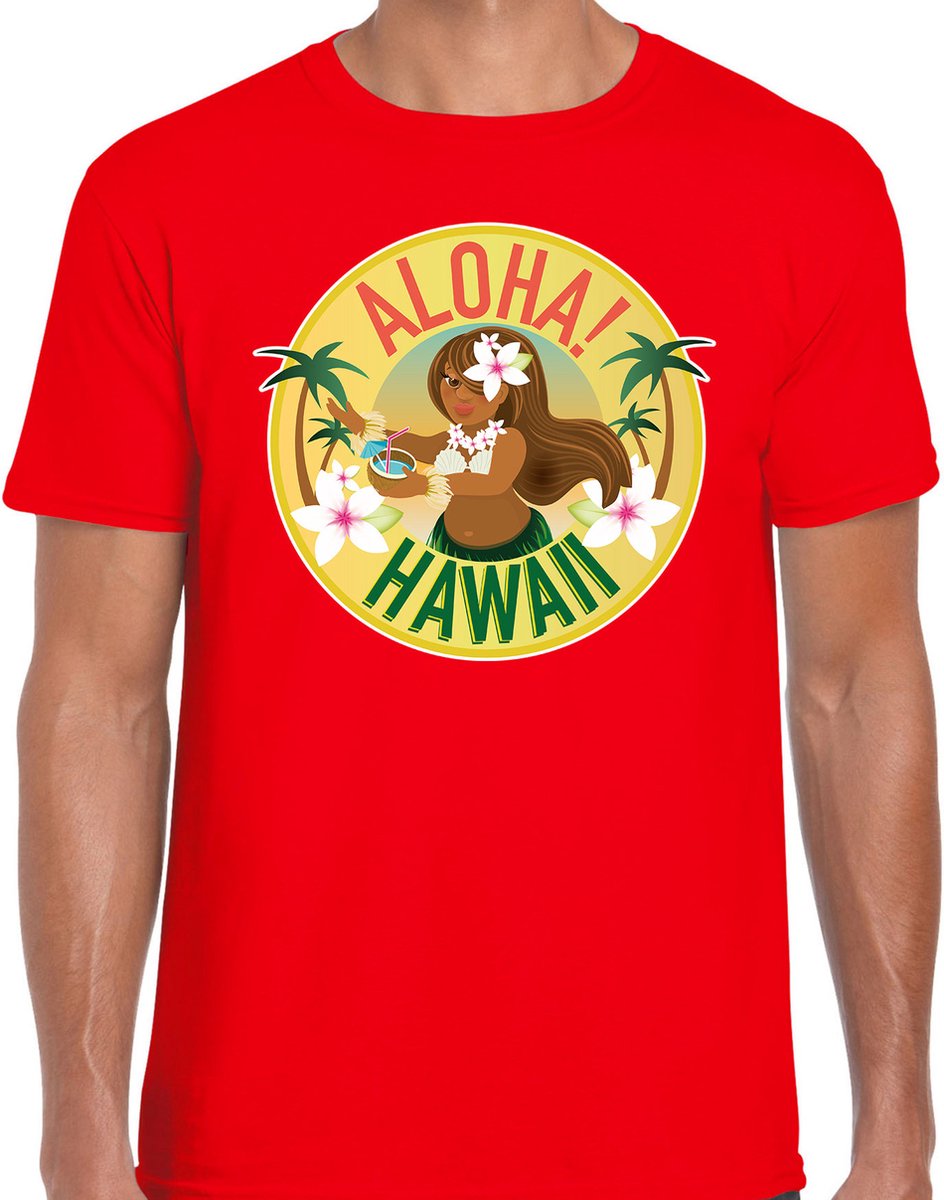 Hawaii feest t-shirt / kleding Aloha Hawaii rood voor heren. Dit feestelijke Hawaii shirt is bedrukt met kleurrijke Hawaiiaanse bloemen, palmen en een Hawaiiaanse vrouw en de tekst: Aloha! Hawaii.