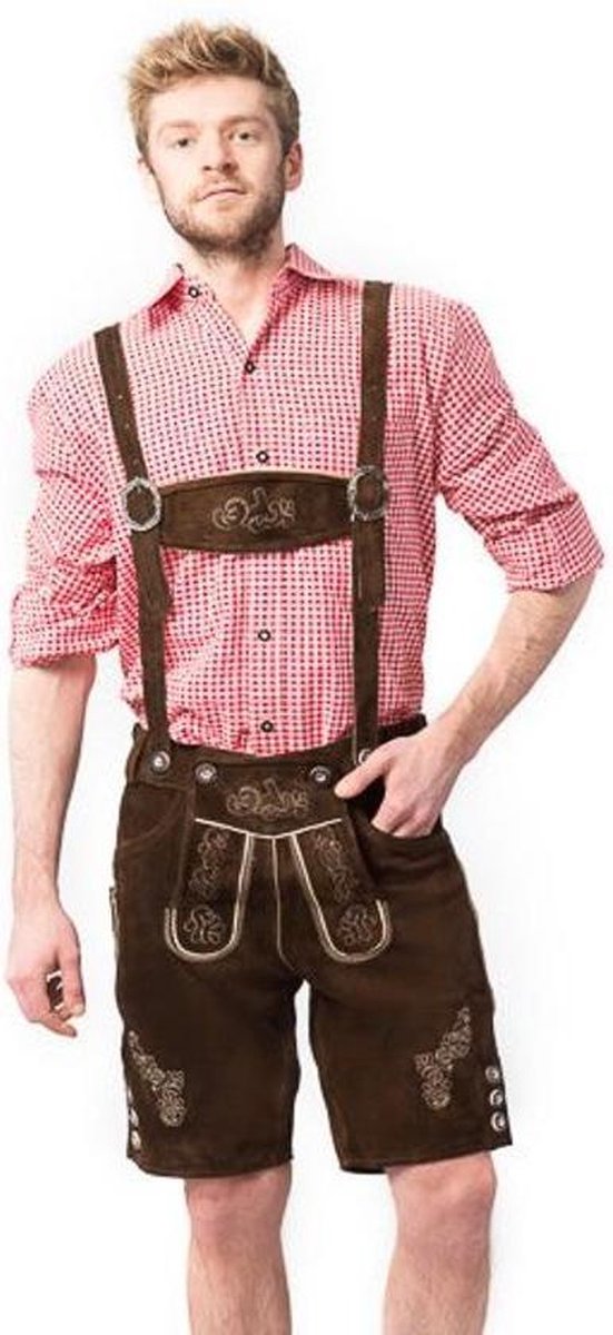 Korte Lederhose voor heren van echt leder Korte Lederhosen voor mannen type: Ralf is een lederhose van 100% echt leder in een korte uitvoering. De Ralf lederhose bestaat uit een bruine kleur.De lederhosen Ralf valt hierdoor net boven de knie. De Oktoberfest lederhose is gemaakt van Premium leder. Deze luxe ledersoort maakt de lederhose Ralf uniek. Lederhosen Ralf is in diverse maten verkrijgbaar. Deze maten lopen van maat 46 t/m 62. Wil jij op het Oktoberfest, de Carnaval of een Apres-ski feestje er perfect bij lopen? Dan is deze lederhose Ralf perfect voor jou. Onze lederhosen voor mannen van 100% leder worden geleverd met lederen bretels en is net als de lederhose zelf voorzien van fraaie stiksels.