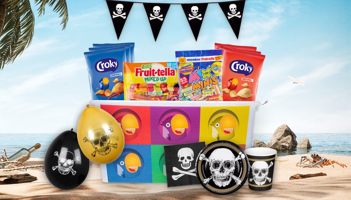 Maak jouw feestje extra speciaal met deze partybox vol lekkers, volledig versierd in het thema ‘piraten’! Geniet samen met je vrienden en familie van Croky chips in de smaken paprika en zout. Daarnaast, vind je in deze box ook verschillende Fruit-tella snoepjes, waaronder de Mixed-Up en Mix of Minis. Je vind er verschillende feestartikelen in piratenthema terug, zoals ballonnen, vlaggen, bekers, bordjes en servetten. Geniet er ten volste van.