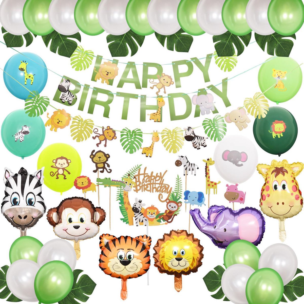 Dit themapakket bevat bijpassende ballonnen, taarttoppers, pompons en slingers. Ook zijn er decoratieve bladeren toegevoegd. Dit maakt de jungle ervaring helemaal compleet