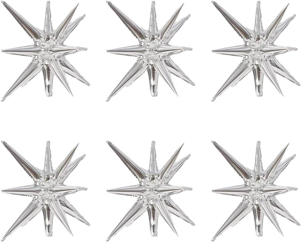 Feestelijke- folieballonnen- explosie- 6 stuks – 55 cm – 12 punten – sterballonnen – kegel – mylar ballonnen – dansfeest – feestartikelen bruiloft – verjaardagsfeest – afstudeerfeest – zilverkleurige ballonnen – decoratie-balonnen – feestdecoratie.