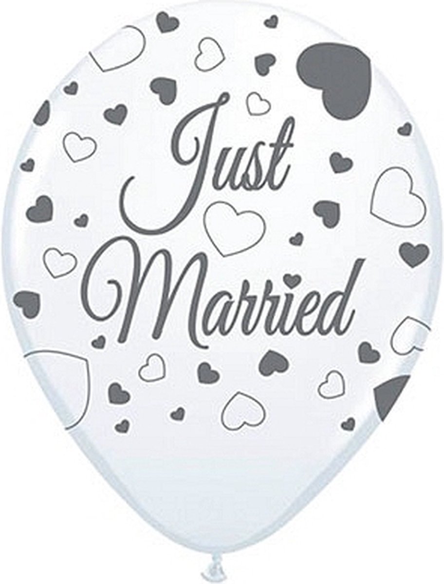 Ballonnen just married van Folat, 8x. Maak van elke bruiloft een onvergetelijk feest met deze ballonnen. De ballonnen in de kleur wit zijn bedrukt in het grijs met hartjes en de tekst ”Just married”. Doordat de ballonnen in de kleur wit zijn, passen ze gemakkelijk op elk feest. De ballonnen zijn gemaakt van latex, en hebben een diameter van 30 cm.