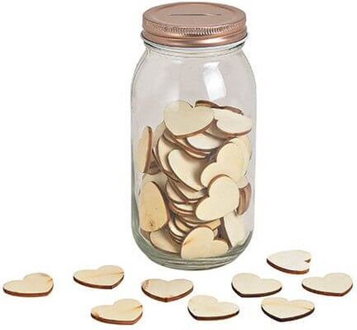 3x Glazen wenspotjes met 100 houten mini hartjes. In deze potjes zitten 100 houten mini hartjes waar je je wensen voor het bruidspaar op kunt schrijven.