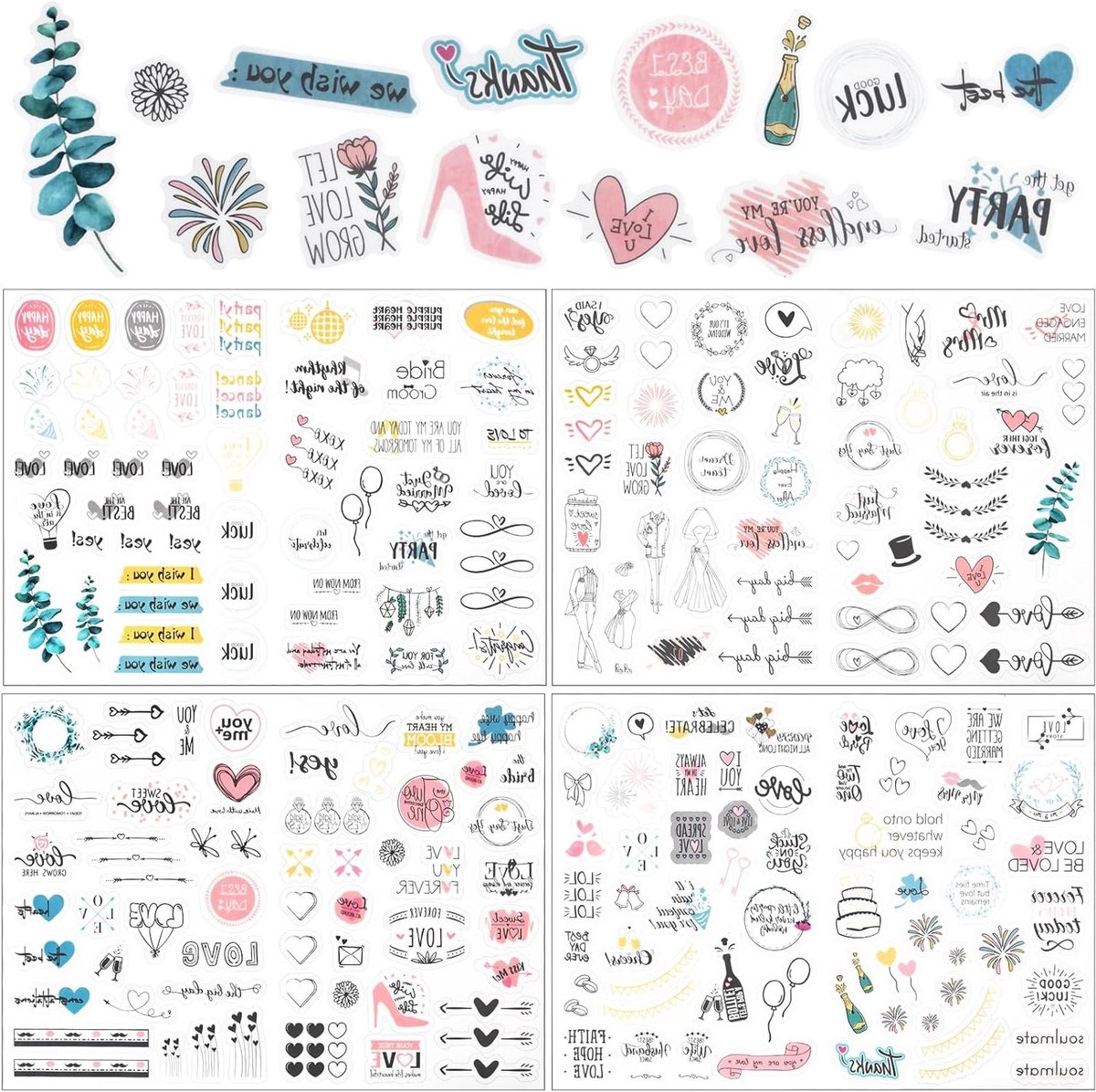 Bruiloftstickerset: de bruiloftsstickerset heeft 230 stickers met een glad oppervlak, print met heldere patronen en rijke stijlen, speciaal voor thematische bruiloften.