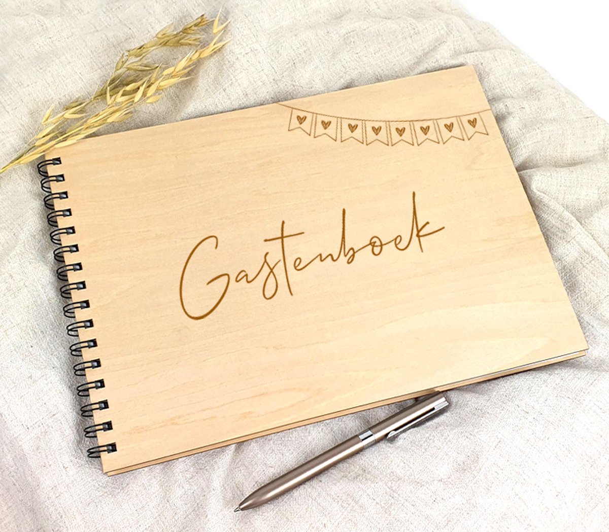 Gastenboek bruiloft – Gastenboek huwelijk – Gastenboek hout – Huwelijk decoratie – A4 houten gastenboek thema “Hartjesslinger”