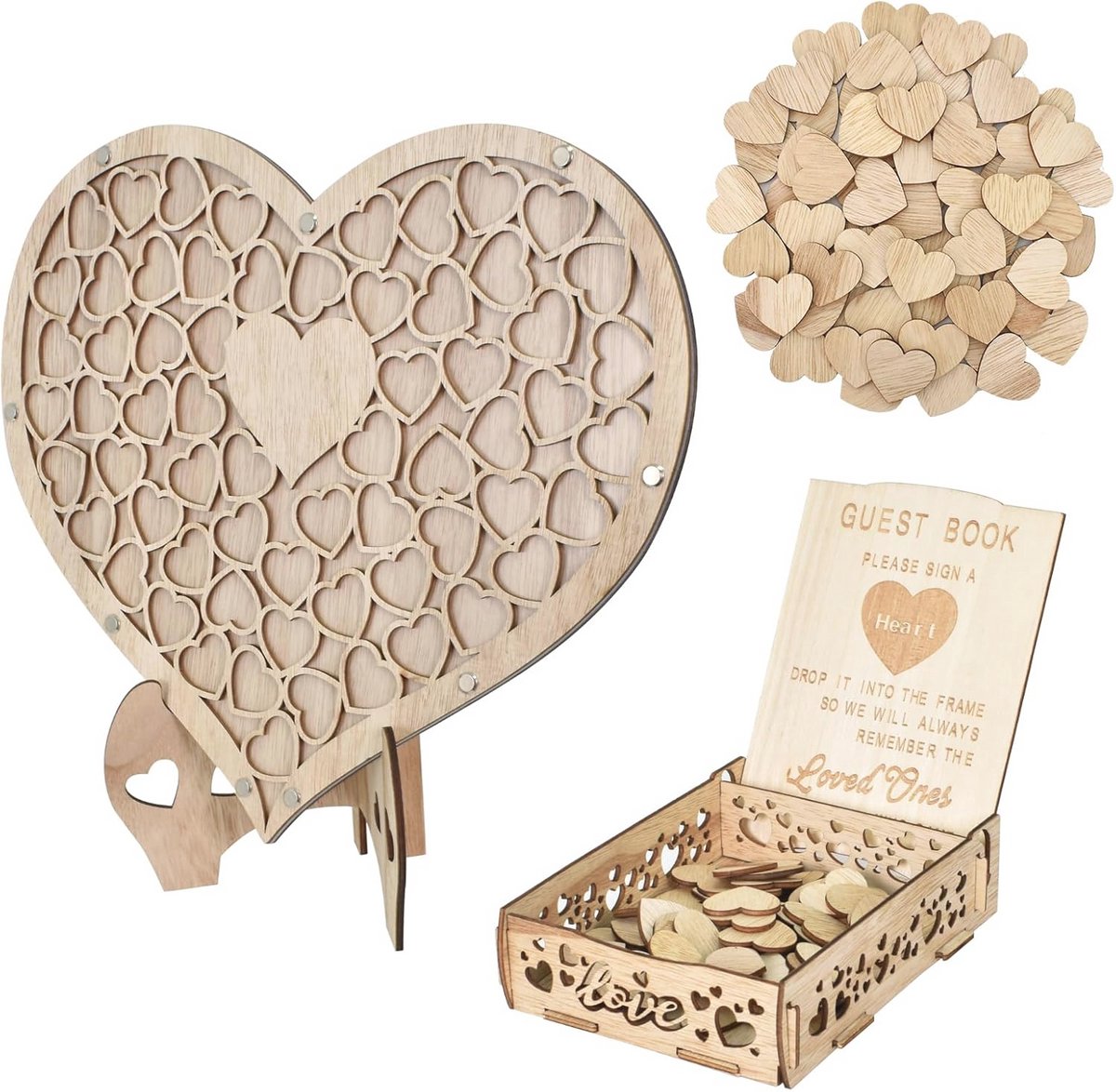 Milieuvriendelijk houten gastenboek in hartvorm (38 x 32 cm) voor een romantische sfeer. Dit unieke gastenboek laat je de liefde en zegeningen bewaren door kleine houten harten te laten ondertekenen door je gasten. Het ontwerp is perfect voor elke trouwdag en zorgt voor onvergetelijke herinneringen. Elke gast kan zijn/haar handtekening op de harten achterlaten die daarna in het grote hart worden geplaatst. Met gladde ronde randen is het veilig en plezierig in gebruik. Deze bruiloftsdecoratie is ideaal voor registraties feesten en speciale evenementen zoals doopfeesten verjaardagen en jubilea. Het komt met een duurzame opbergdoos voor eenvoudig gebruik en opslag. Maak je bijzondere dag onvergetelijk met dit hartverwarmende gastenboek!