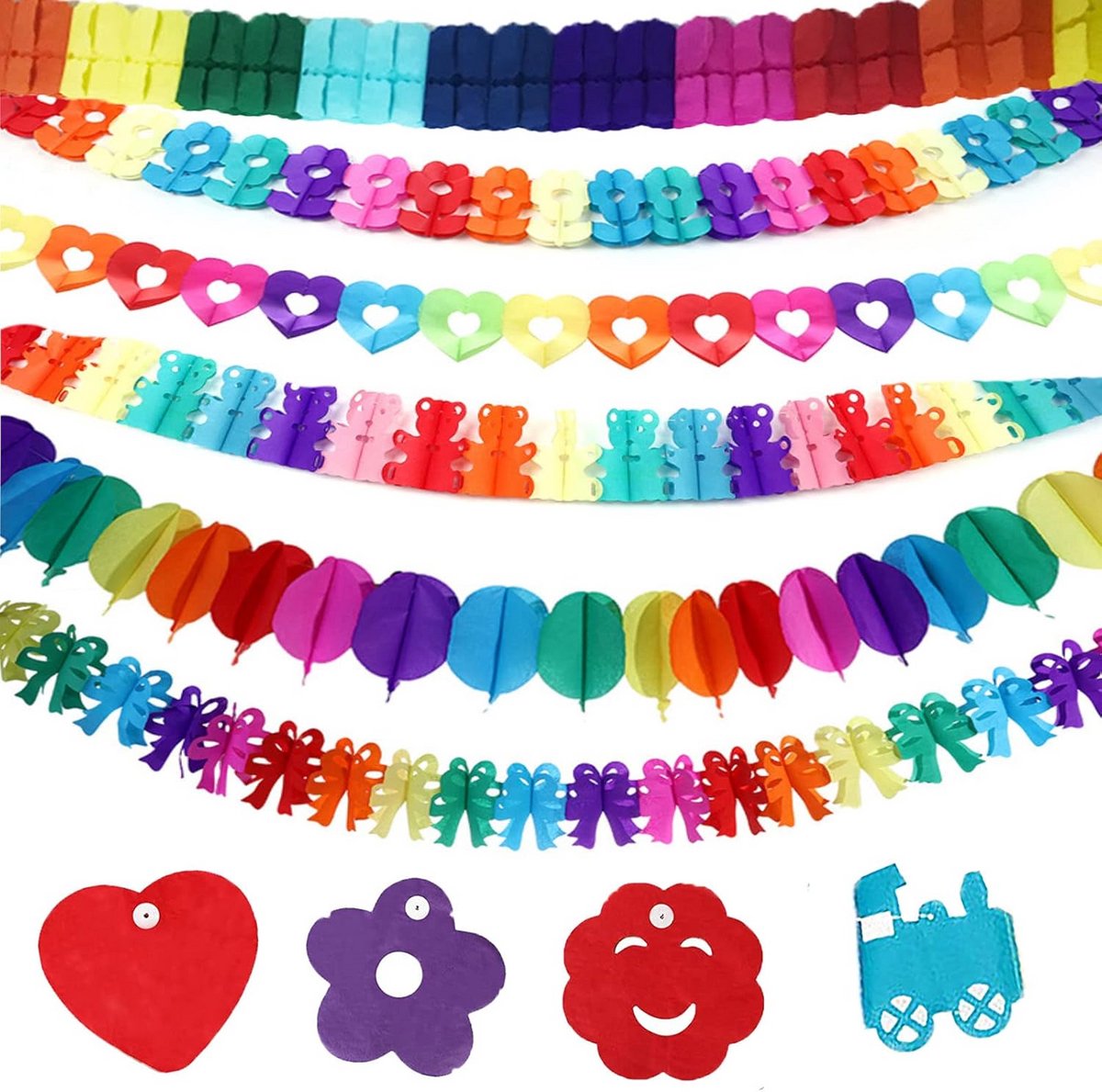 Set van 10 kleurrijke papieren slingers ideaal voor diverse feestelijke gelegenheden zoals verjaardagen, bruiloften, baby showers en carnaval. Deze slingers zijn gemaakt van hoogwaardig papier en trekkoord, wat zorgt voor een heldere kleur en duurzaamheid. Ze zijn herbruikbaar en na gebruik eenvoudig op te vouwen voor opslag. Elke slinger is ongeveer 3 meter lang na uitvouwen en kan indien nodig op maat worden geknipt. Perfect als feestdecoratie voor lente, carnaval en andere vieringen. Let op: Houd verwijderd van open vuur.