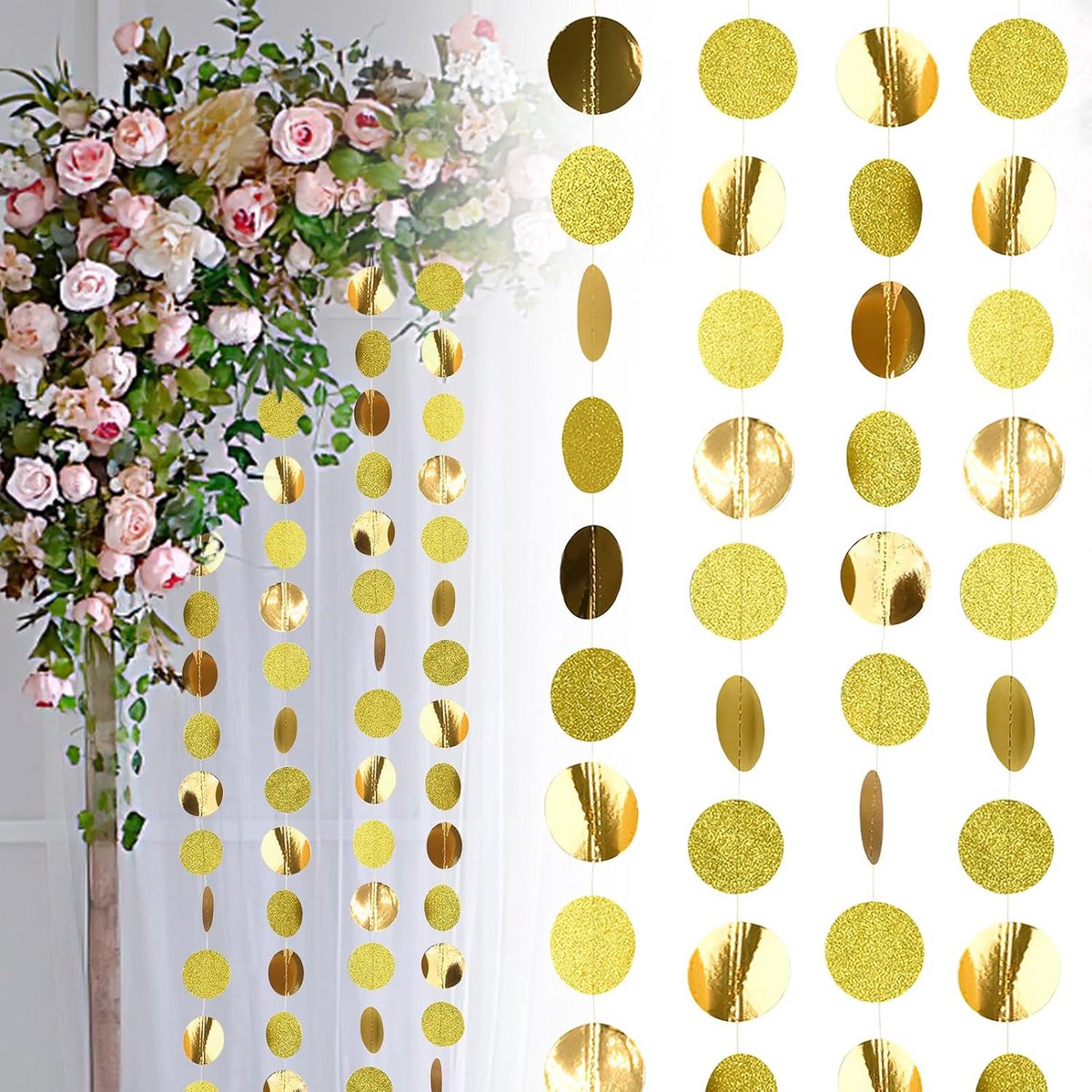 Voeg een dromerige sfeer toe aan elke ruimte met deze fonkelende papieren slinger. Deze set bevat 4 gouden slingers met ronde cirkels, elk 4 meter lang, voor een totaal van 16 meter decoratie. Perfect voor bruiloften, verjaardagen, Kerstmis, Halloween of als decoratie voor slaapkamers en winkels. De cirkels zijn goud van kleur en zorgen voor een feestelijke uitstraling. Tip: Om klitten te voorkomen, raden we aan de slingers voorzichtig en één voor één uit te pakken en op te bergen. Neem bij vragen gerust contact op met onze klantenservice.