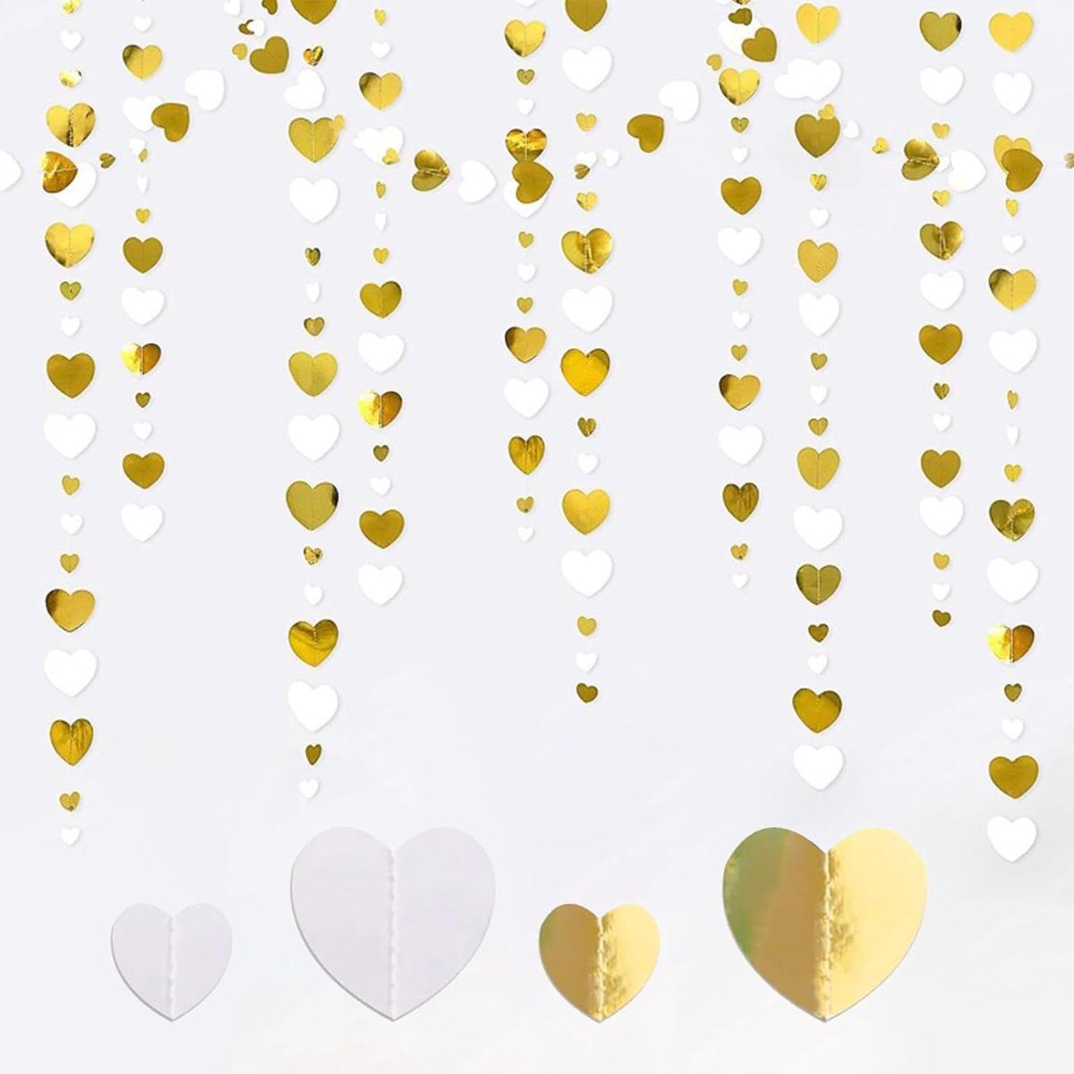 4 stuks hangende papieren slingers in wit en goud met hartjes – Voor bruiloften, verjaardagen en feesten – 75 karakters of meer