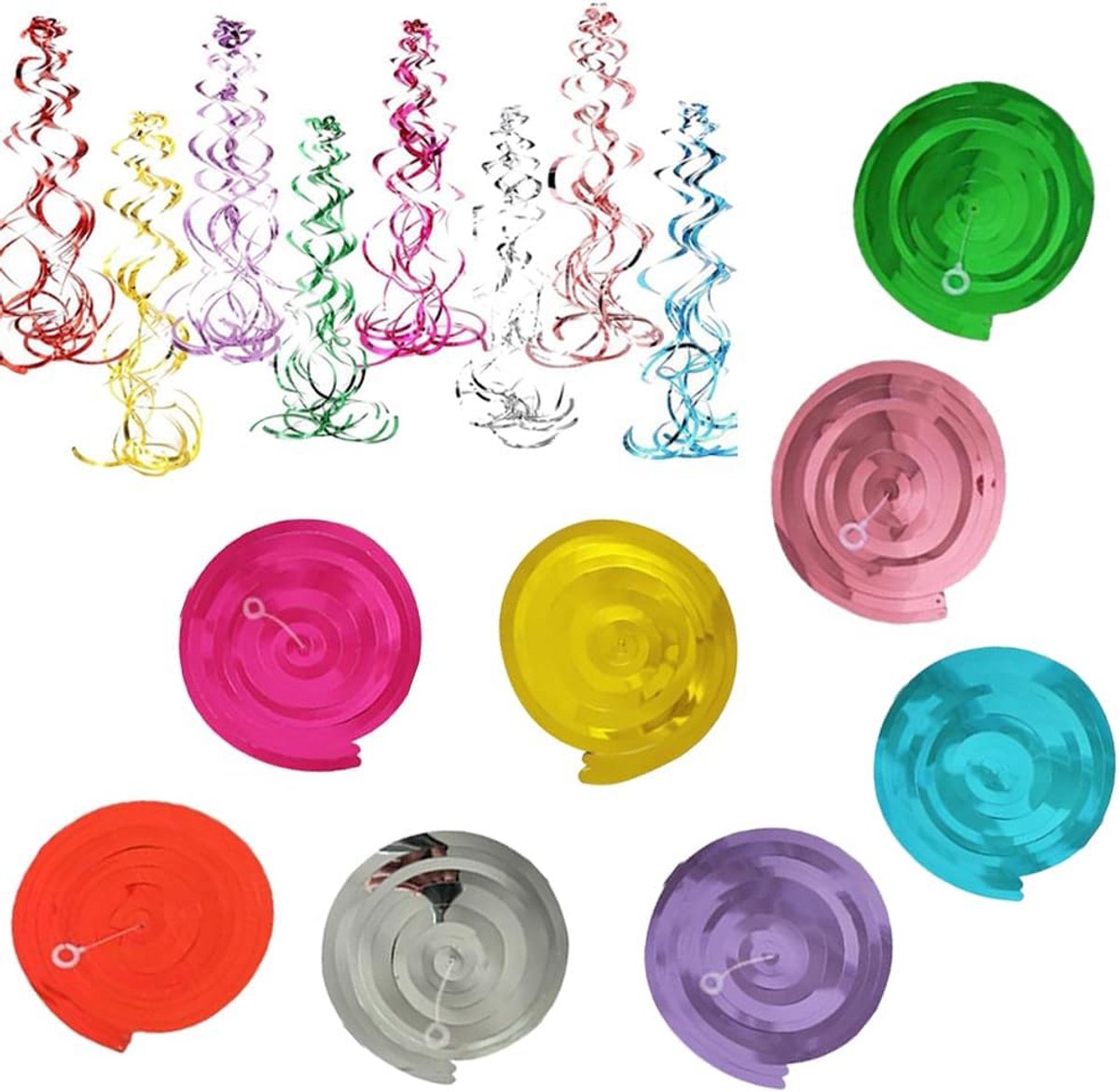 Maak uw feest compleet met deze set van 48 hangende spiralen en slingers! Ideaal voor het decoreren van het plafond op diverse gelegenheden zoals verjaardagen, bruiloften, Kerstmis, carnaval of elk ander feest. De folie wervels zorgen voor een vrolijke en feestelijke sfeer. Eenvoudig op te hangen en een directe blikvanger voor uw feestlocatie.