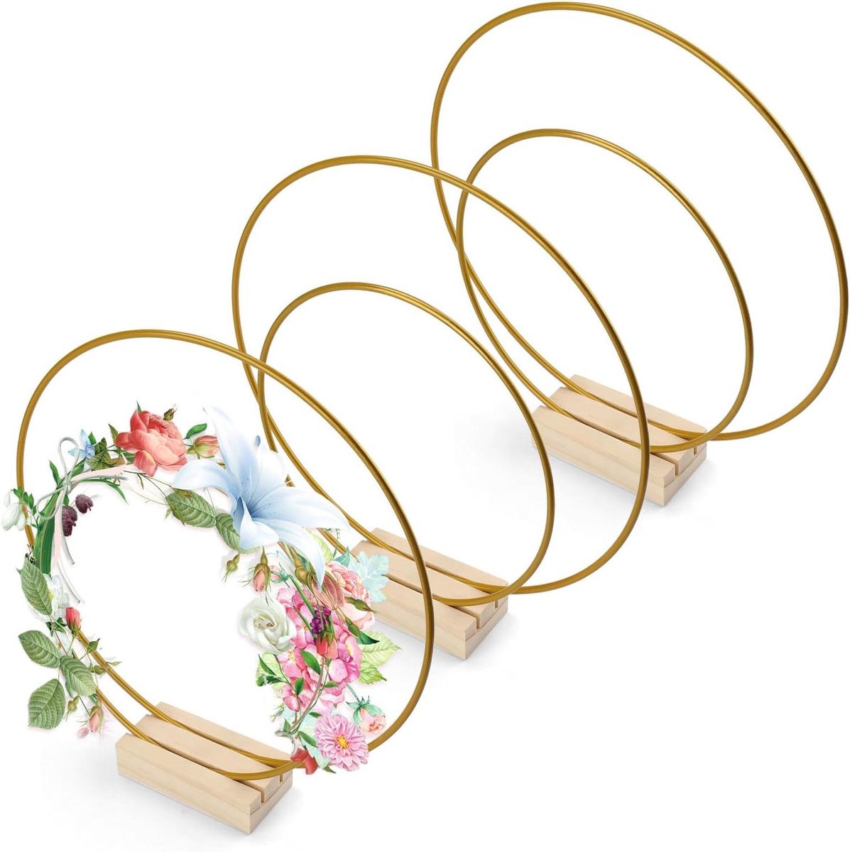 Praktische extra’s: De set bevat 3 gouden slingers met verschillende diameters en diktes, samen met een houten frame van ideale afmetingen voor het maken van prachtige tafeldecoraties bij bruiloften.