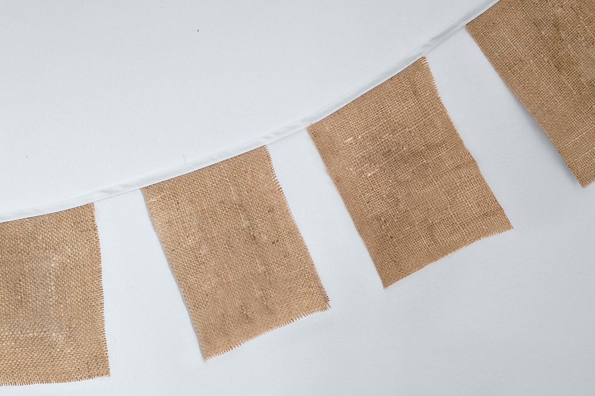 Slinger met jute vlaggetjes, met de hand gemaakt van jute. Voor het versieren van je feestje, zoals je huwelijk, bruiloft, jubileum, verjaardag, babyshower, kraamborrel of geboorte.