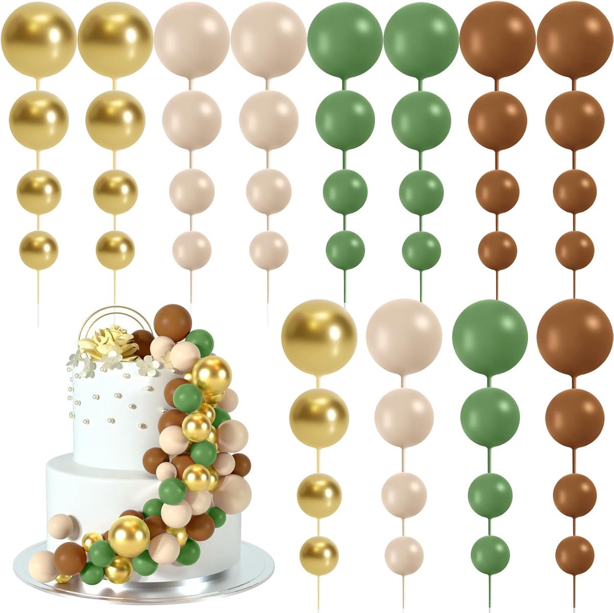 48 stuks taartdecoratie, taarttoppers, taartdecoratie, ballon, cupcake, taarttoppers voor verjaardag, feest, bruiloft, babyshower, taartdecoratie (groen, bruin, wit, goud)
