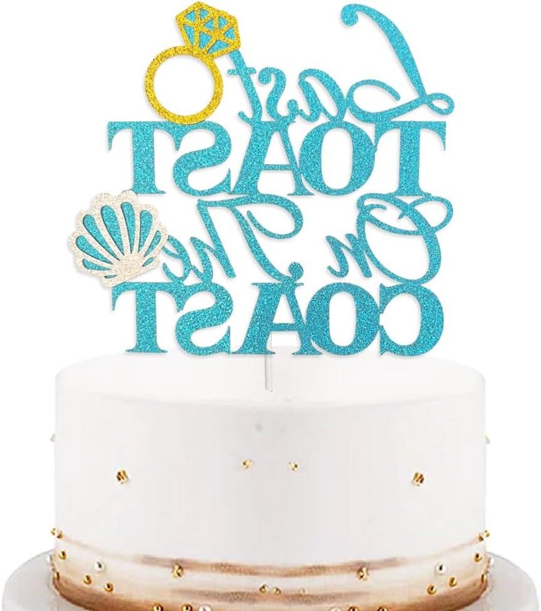 Voeg een vleugje elegantie toe aan je feest met deze Last Toast On The Coast cake topper. De blauwe, zilveren en gouden glitter maken elke taart extra feestelijk.