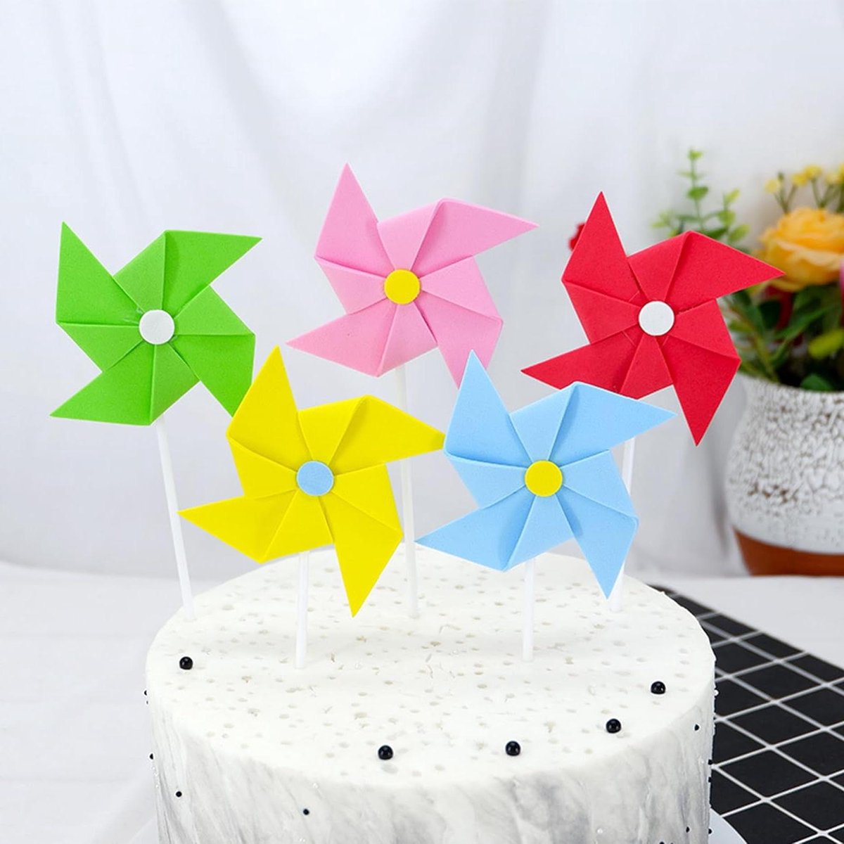 Je ontvangt 15 pinwheel-taartdecoraties in 5 kleuren: blauw, geel, groen, rood, roze, perfect voor een zoet verjaardagsfeestje voor je kind!