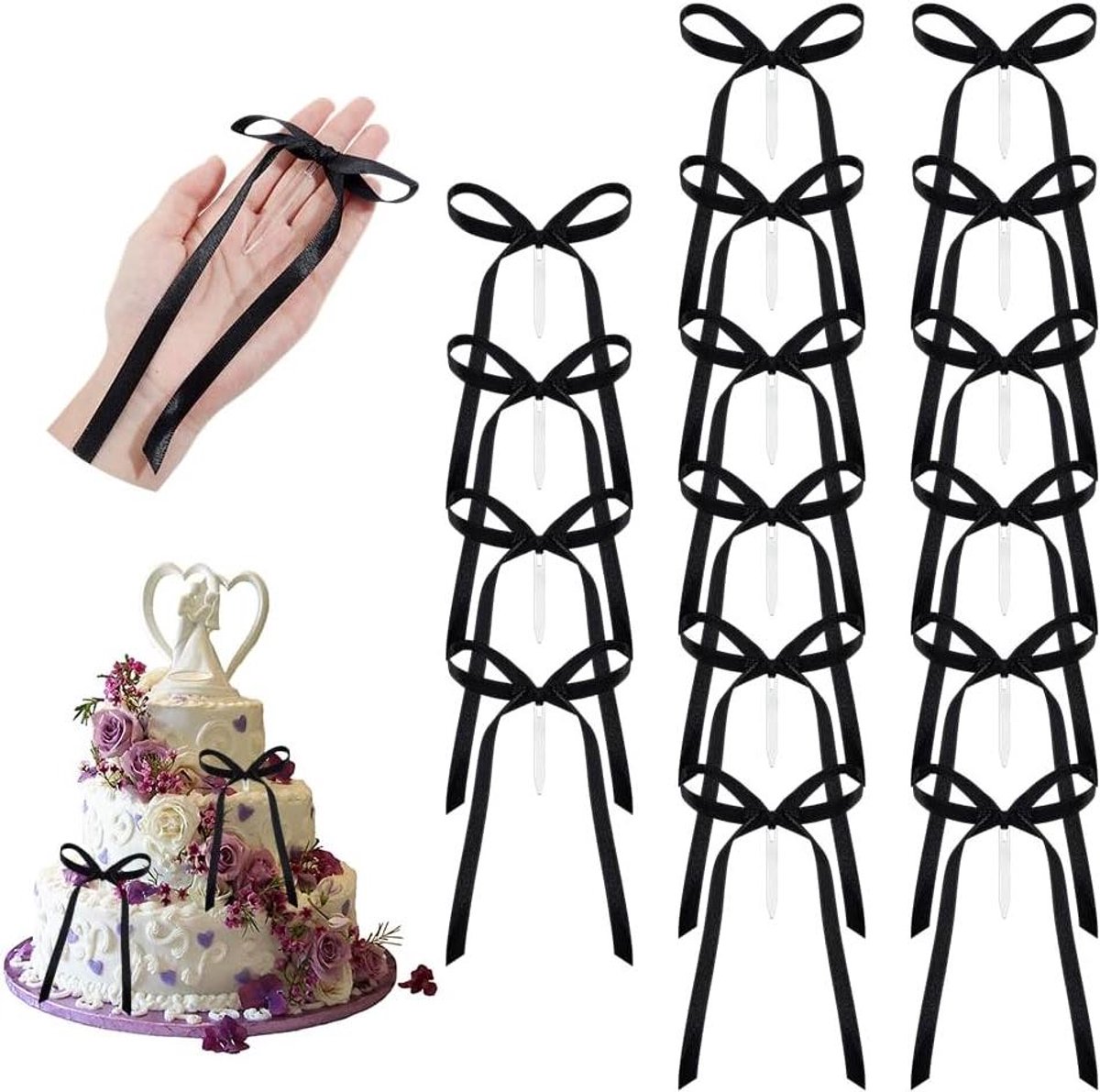 Allecto plus – Zwarte strik lint taarttoppers – Set van 16 – Voor taartbenodigdheden – Verjaardag, bruiloft en feestdecoraties – 17 x 12 cm