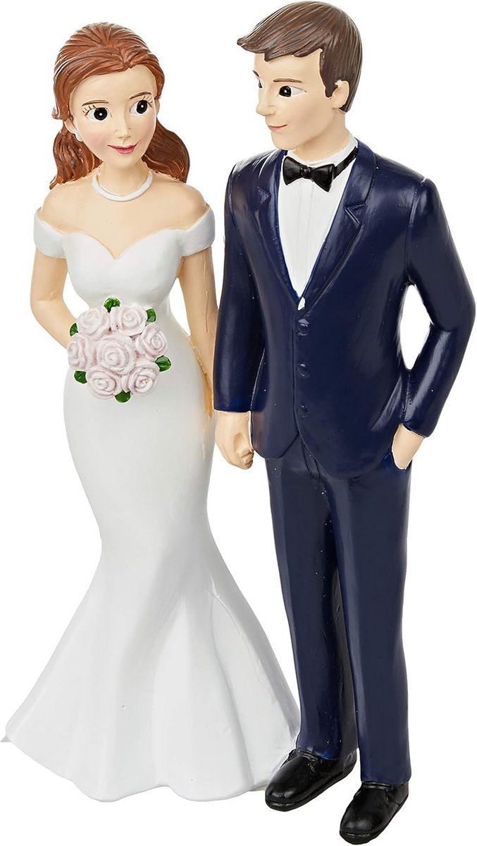 Elegante taartfiguur van 21 cm hoog, perfect voor uw bruidstaart. Deze decoratie toont een bruidegom in smoking en een bruid in een witte zeemeerminjurk. Na de festiviteiten kunt u de figuur gebruiken als blijvende decoratie in huis of als inspirerend cadeau voor vrienden. Een uniek product met een uitstekende prijs-kwaliteitverhouding. Tip: voor het plaatsen op de taart adviseren wij om fondant of een laagje marsepein te gebruiken, en deze laag voor het aansnijden te verwijderen. Ontwerp auteursrechtelijk beschermd.