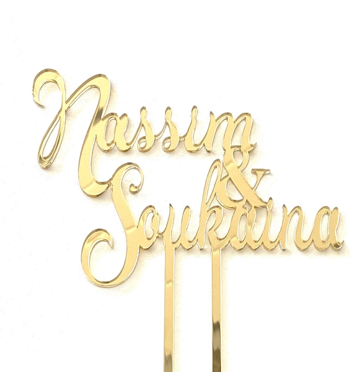 Taarttoppers of cake toppers gepersonaliseerd met twee namen.