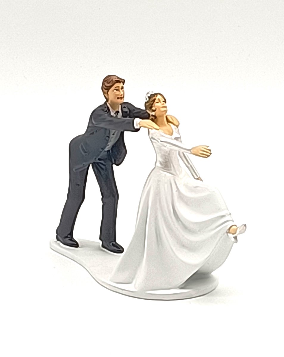 Geef jullie bruidstaart een knipoog met deze hilarische bruiloft taarttopper! De Runaway Bride rent weg in haar trouwjurk terwijl de bruidegom wanhopig achter haar aanloopt – een grappige twist op het klassieke liefdesverhaal.